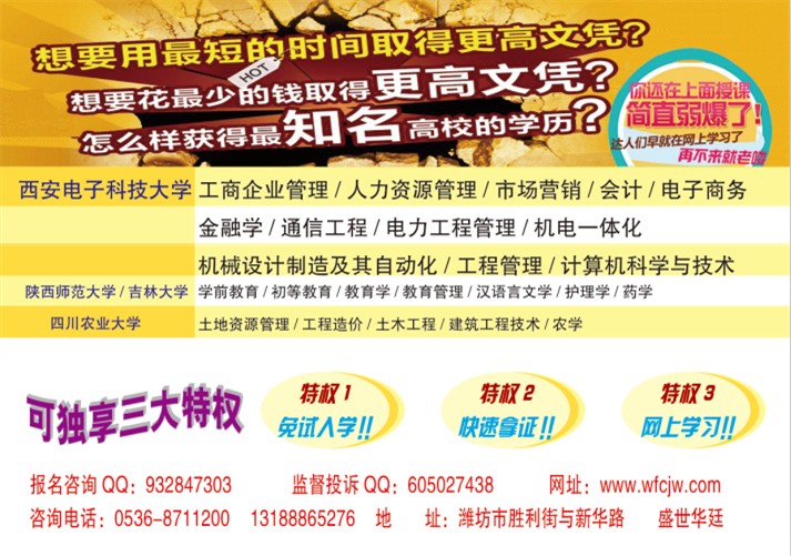 2016年成人高考报名火热进行中,在2016年实现自己学历和专业的提升与飞跃,给自己人生一个崭新的起点,赢得职场竞争中的先机!报名咨询热线: 0536-8232768 (24小时)